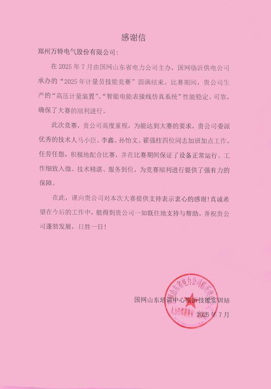 國網(wǎng)山東培訓(xùn)中心臨沂技能實(shí)訓(xùn)站在感謝信中特別提到:“貴公司技術(shù)人員任勞任怨,積極配合比賽進(jìn)程,在高強(qiáng)度工作壓力下確保了設(shè)備零故障運(yùn)行,為競賽順利進(jìn)行提供了強(qiáng)有力的技術(shù)保障。”